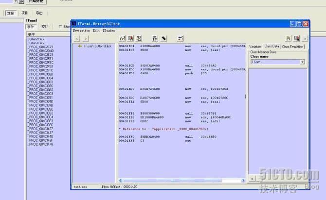 注意选择“过程”按钮,如上图所示。然后双击右下侧列表中的Button3Click,就可以查看该方法对应的函数体了。当然,这样看到的函数体不会是我们一般意义上的函数体,这函数体只有一个框架是高级语言的样子,函数体内部都是汇编代码,不过这已经足够了,后面我们还要进行详细的反汇编调试分析呢。嘿嘿。函数体示意图5如下:
