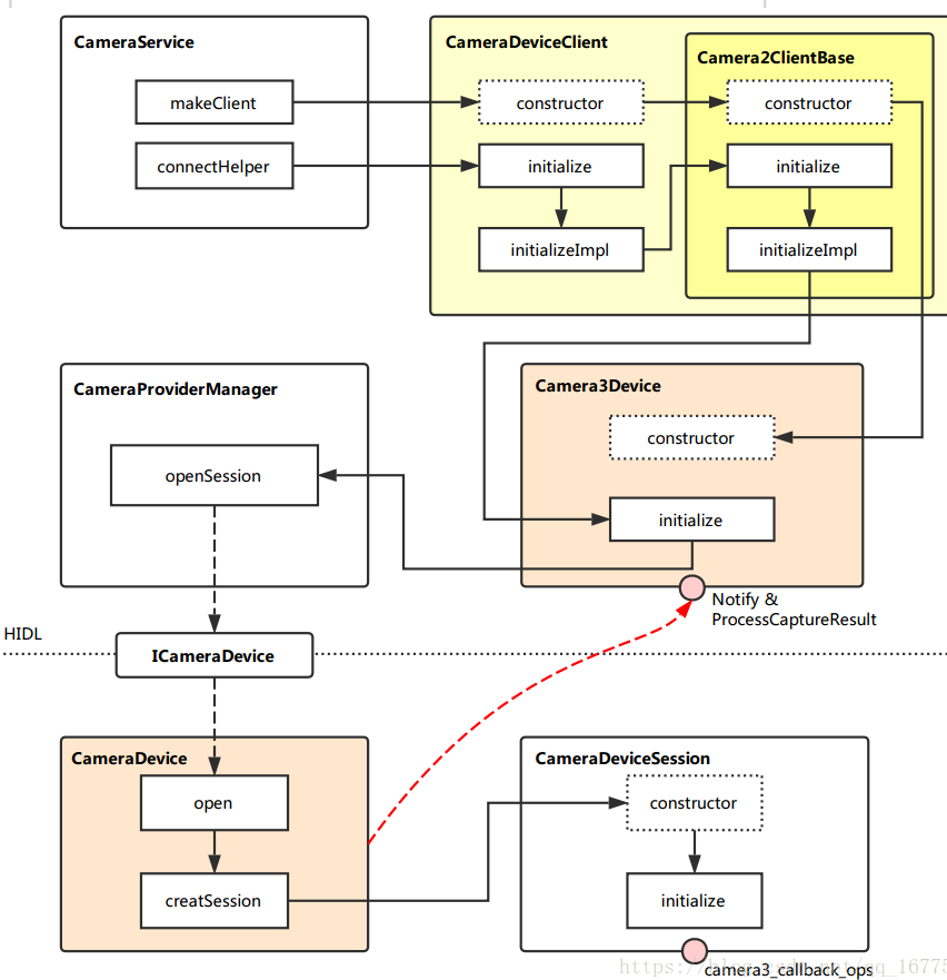 1.Camera HAL3 构建连路的过程,如下图(红色虚线是上行路线,黑色虚线则是下行路线):