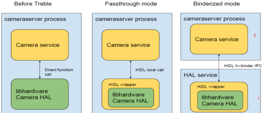 在 Android O 中,系统启动时,会启动一个 CameraProvider 服务,它是从 cameraserver 进程中分离出来,作为一个独立进程 android.hardware.camera.provider@2.4-service 用来控制 camera HAL,cameraserver通过 HIDL 机制于camera provider进行通信。HIDL源自于 Android O 版本加入的 Treble 机制,它的主要功能是将 service 与 HAL 隔离,以方便 HAL 部分进行独立升级,类似于 APP 与 Framework 之间的 Binder 通信机制,通过引入一个进程间通信机制而针对不同层级进行解耦(从 Local call 变成了 Remote call)。如下图: