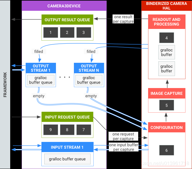 每个被submit到hal的request都必须携带stream。stream分为input stream和output stream:input stream对应的buffer是已有图像数据的buffer,hal对这些buffer进行reprocess;output stream对应的buffer是empty buffer,hal将生成的图像数据填充的这些buffer里面。
