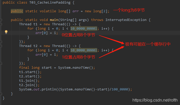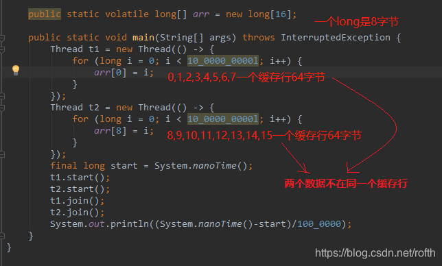 分析两段代码,代码1的性能肯定慢于代码段2,原因分析:【代码段1】:因为一个long是8个字节,两个元素加起来也就16个字节,极有可能存在主内存中是同一个缓存行,加上因为volatile的可见性,线程1改了arr[0],线程2立马就会去主内存获取最新的,线程2改了arr[1],线程1立马就会去主内存获取最新的,这样性能就大打折扣,这就是伪共享。【代码段2】:因为元素0,1,2,3,4,5,6,7共64字节在一个缓存行中,8,9,10,11,12,13,14,15共64字节在另一个缓存行中,所以,线程1改了arr[0],线程2并不会去获取最新的值。同理,线程2改了arr[8],线程1也不会去获取最新的值,这就是缓存行填充/对齐优化,这个也是很多框架中用到的性能优化点,著名的队列框架disruptor就是用的这种优化