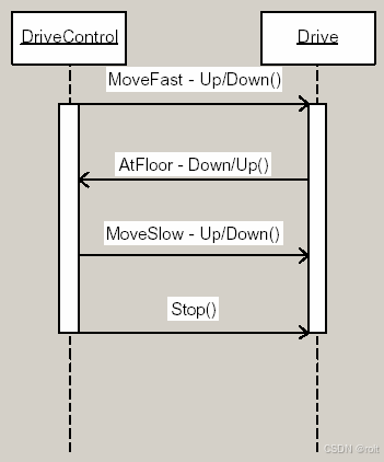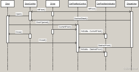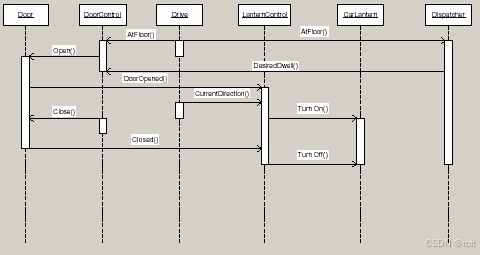 这个用例有二个场景,分享一个顺序图:场景 5.1 指示移动方向 (向上的) –电梯的门打开及电梯的目的方向是向上的,向上的 CarLantern 亮。门关闭时,CarLantern 熄灭。