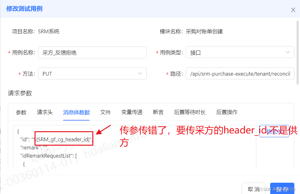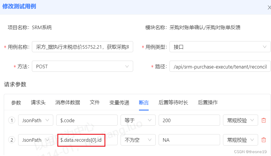 采购对账测试业务流程中,其中一个测试步骤总是失败,原因是用例中参数写错及断言不明确