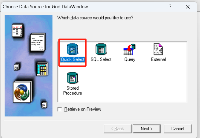 ① 单击菜单栏上的File–>New命令,在弹出的窗口中选择DataWindow选项卡中的Grid风格的数据窗口