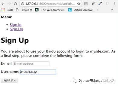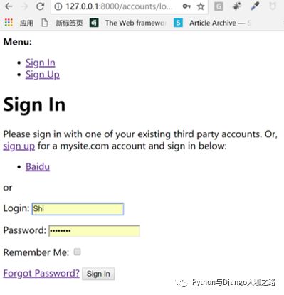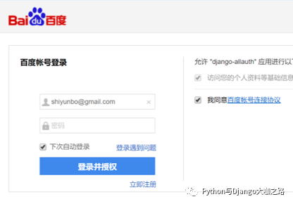 这时当你访问/accounts/login/, 你会发现多了个baidu的登录选项。