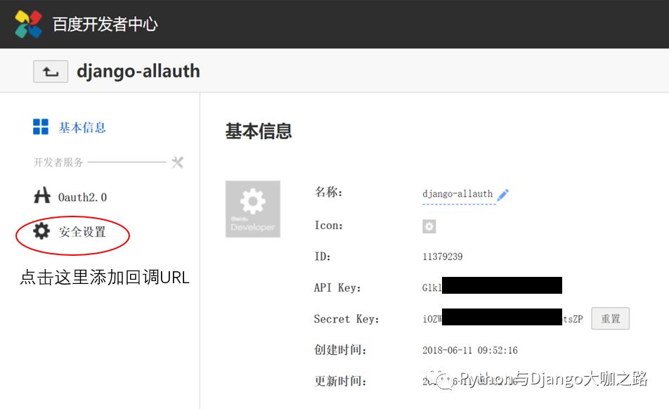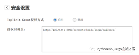 应用创建好后,你还需要点击安全设置,设置回调URL。这样当百度授权登录完成后,可以跳转回自己的网站。回调URL地是: http://127.0.0.1:8000/accounts/baidu/login/callback/, 如下图所示: