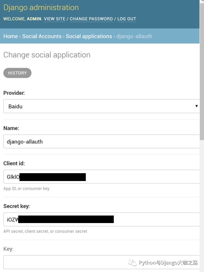 在django的admin点击socialapplications, 输入baidu提供的API key(也被称为client id)和secret key即可。如下图所示: