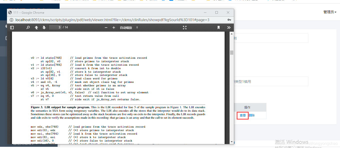 点击【查看】按钮,触发JS中的window.open事件,实现了web浏览服务器中指定pdf书籍的功能。