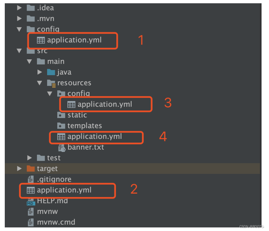 配置⽂件除了可以放置在 resources 路径下之外,还有 3 个地⽅可以放置,如下图所示。
