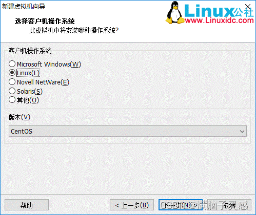 【客户机操作系统】及对应的【版本】,选择“Linux”与“CentOS”,单击【下一步】。