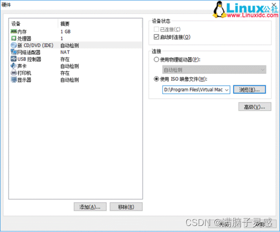 单击【自定义硬件】,可以设置内存、处理器、网络适配器等,这里先设置镜像 - 用于引导系统安装,关于网络等设置后面讲解。