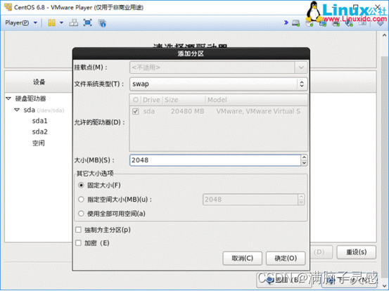 创建swap分区,要先选择文件类型为swap(这时第一项挂载点将不可用),如果内存小于4G内存,设置为内存的2倍,如果是4G以上,和内存设置一样大即可。