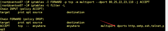iptables -I FORWARD -p tcp -m multiport --dport 80,25,22,23,110 -j ACCEPT
