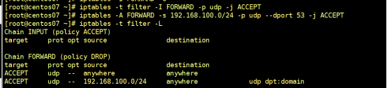 iptables -A FORWARD -s 192.168.100.0/24 -p udp --dport 53 -j ACCEPT