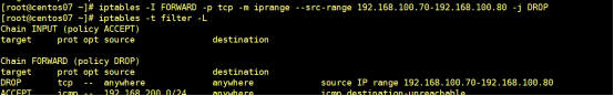 iptables -I FORWARD -p tcp -m iprange --src-range 192.168.100.70-192.168.100.80 -j DROP
