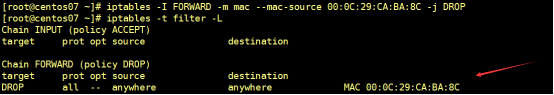 iptables -I FORWARD -m mac --mac-source 00:0C:29:CA:BA:8C -j DROP