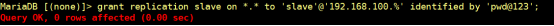 grant replication slave on *.* to 'slave'@'192.168.100.%' identified by 'pwd@123';