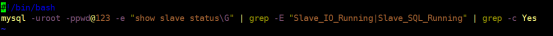 mysql -uroot -ppwd@123 -e "show slave status\G" | grep -E "Slave_IO_Running|Slave_SQL_Running" | grep -c Yes