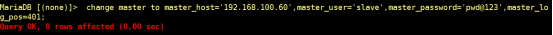 master_user='slave',master_password='pwd@123',master_log_pos=401;