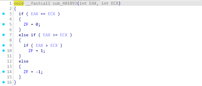 这里对 ZF 进行赋值,如果 EAX 等于 ECX,ZF=0,如果小于,ZF=-1,如果大于 ZF=1