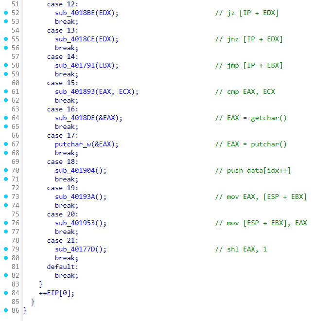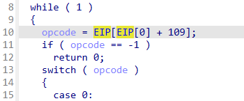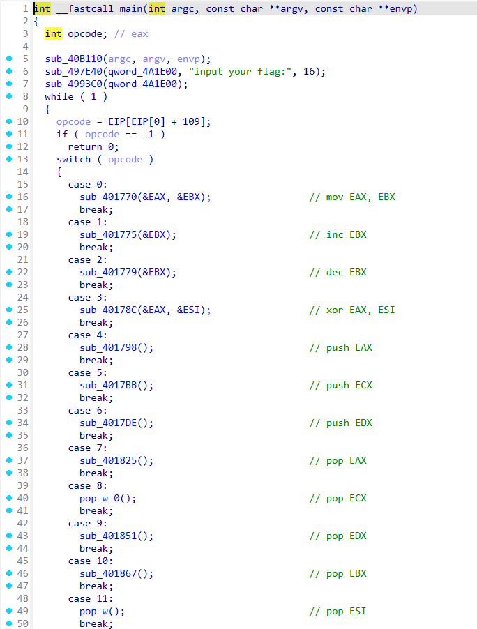 IDA 打开,main 函数中有很多 switch-case 语句,可以判断可能是 VM 程序