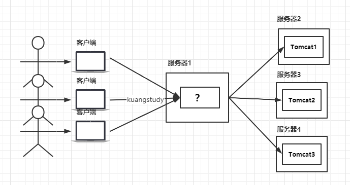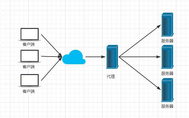 于是我们横向扩展,又增加了服务器。这个时候几个项目启动在不同的服务器上,用户要访问,就需要增加一个代理服务器了,通过代理服务器来帮我们转发和处理请求。