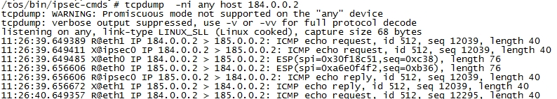 11:26:39.656606R@eth0 IP 185.0.0.2 > 184.0.0.2:ESP(spi=0xa6e0f4f2,seq=0xb36), length 76