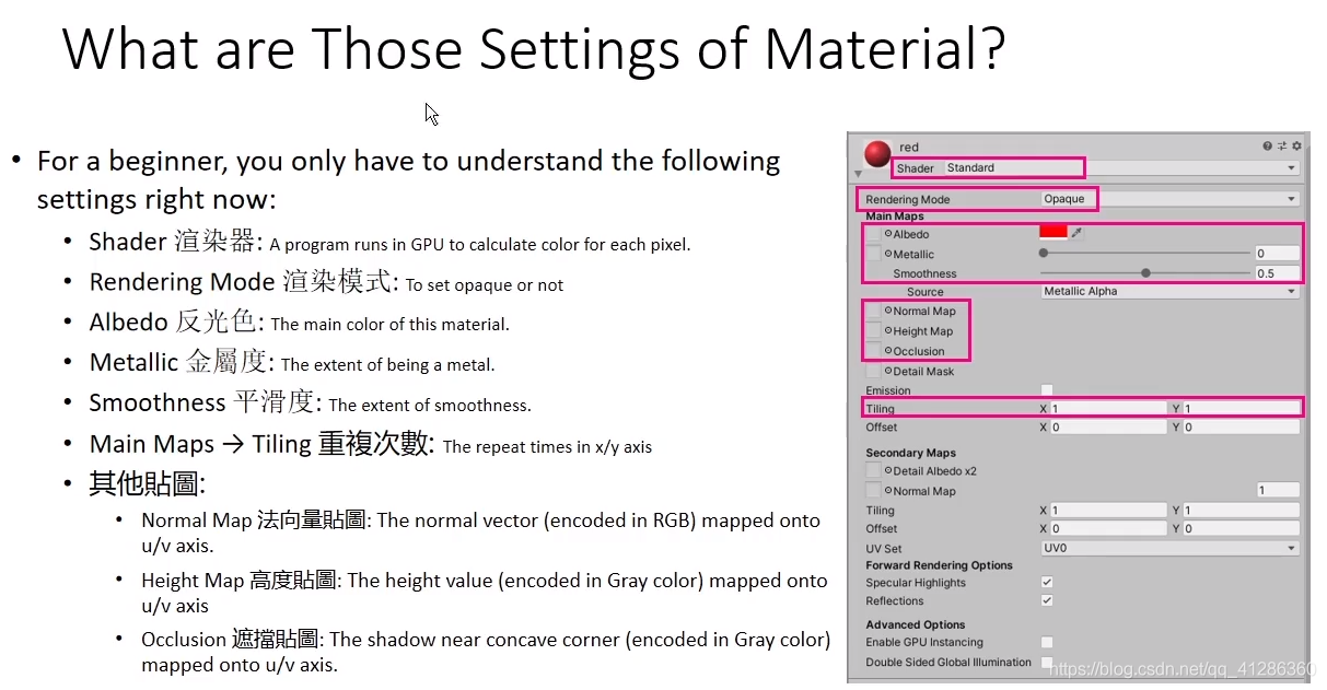 本文介绍了Unity中材质的设置,包括渲染模式:不透明、cutout、fade和透明,以及Main Maps和各种贴图的应用。重点讨论了漫反射贴图、金属度贴图、法线贴图、高度贴图、环境阻塞贴图等,阐述了它们在增加模型真实感和细节表现中的作用。