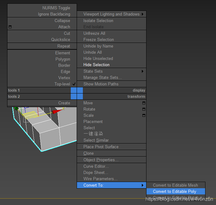 1.通过选中模型右键选择转换为可编辑多边形(Editable Poly)命令,把建好的模型转换为可编辑多边形物体