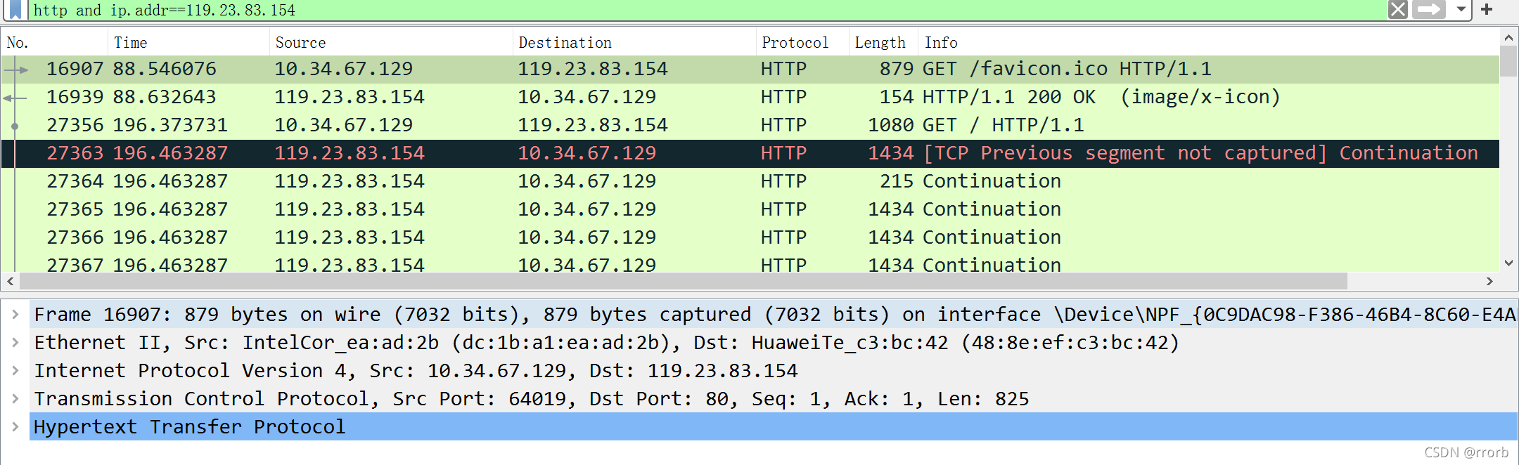 打开wireshark,使用下面的过滤器获取HTTP协议且与该IP地址相关的信息