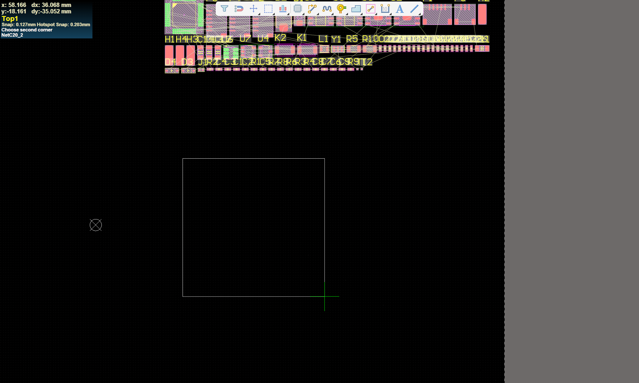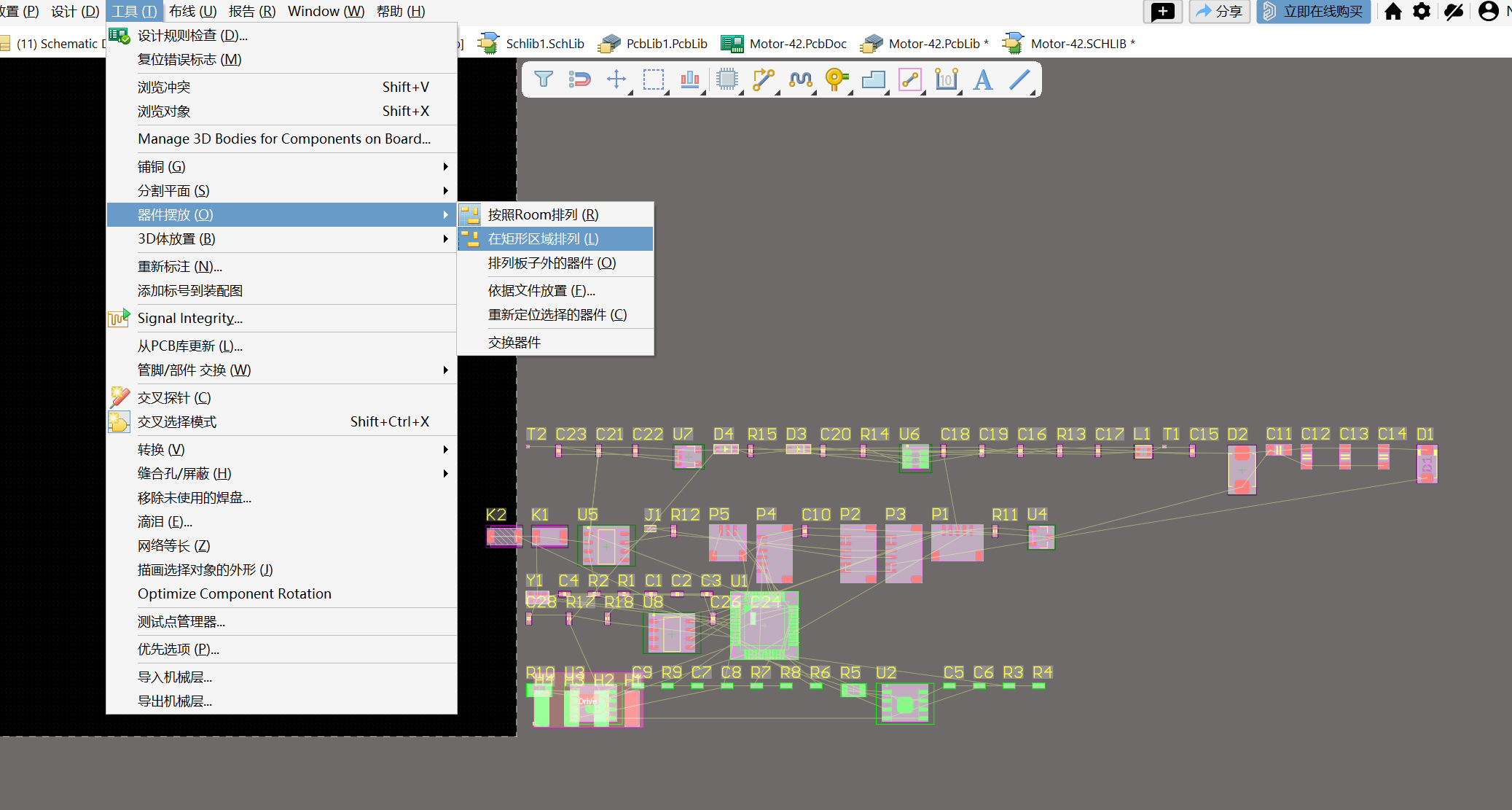 1. 导入原理图到PCB后,工具(T)-> 器件摆放 (O)- 在矩形区域排列(L)。