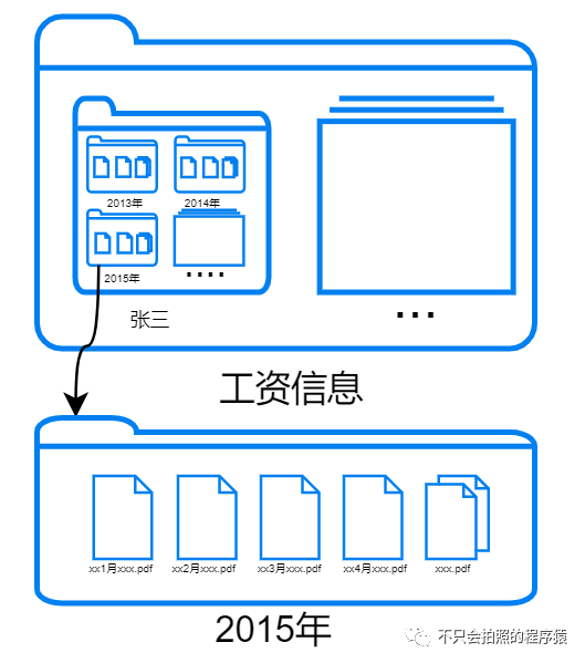 1. 首先有一个根目录(工资信息),存放所有员工工资信息,不同员工之间以目录的方式分开存放,如张三、李四等。
