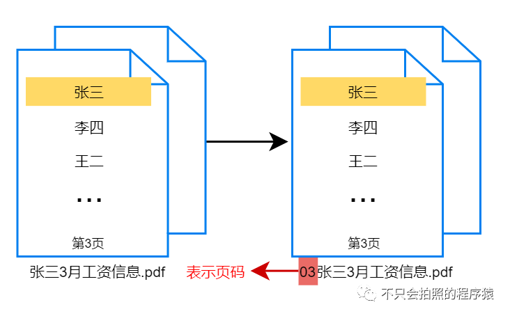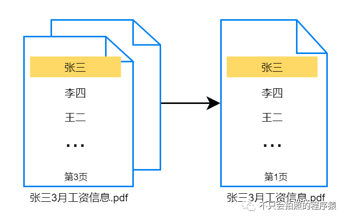 某一天,就跟正常的每一天一样的某一天,xxx给我发消息,说他们部门马上进入繁忙期,每个人都不能幸免,要开始拼命加班了,不明所以的我还以为他们接了什么大项目,后来一问才知道原来是他们公司把近几年所有同事的工资信息扫描录入一个pdf文件里面,而他们需要找到每个人的工资条并标注,然后单独提取出来放在一个新的pdf文件里面,由于员工的数量庞大,而且信息较多,所以需要动用大量的人力来完成。