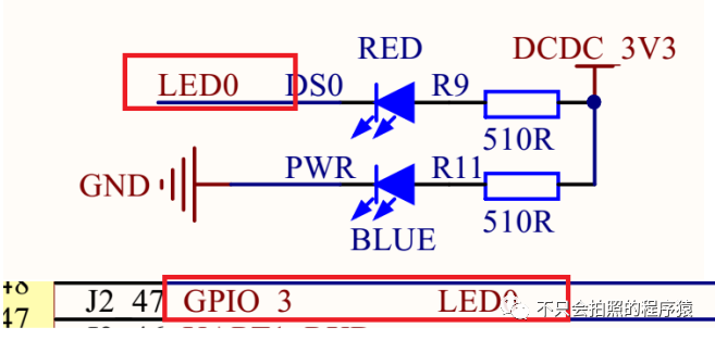 ★查看并分析原理图,确定GPIO1-IO03连接LED0,且输出低电平LED点亮,输出高电平LED熄灭。