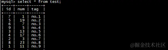 然后插入下面的数据,id从1-9,故意把插入顺序打乱,tag代表插入顺序