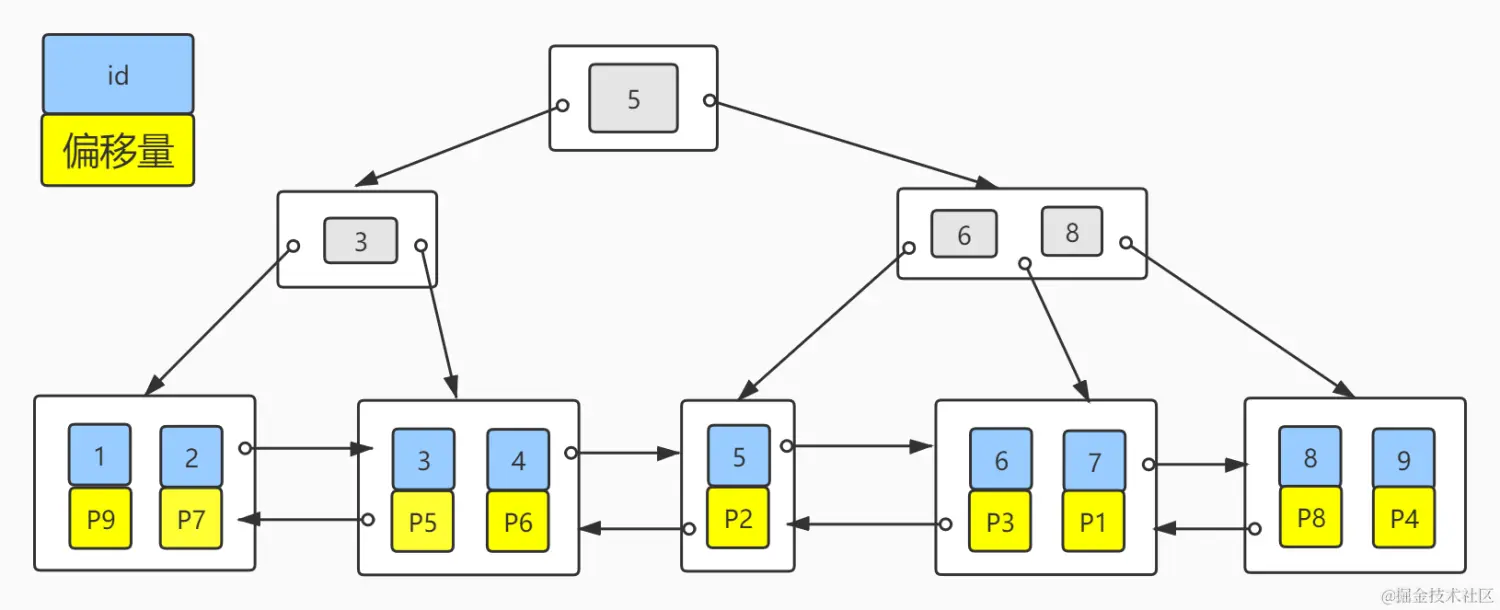 搞清楚了MyISAM的数据存储方式,再来看下主键索引的存储。我们假设每个磁盘块只能存储两个节点数据,MyISAM的主键分布如下图:
