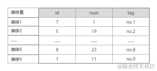 MyISAM按照数据插入的顺序存储在磁盘上,我们假设第一行数据在数据库表文件中的偏移位置是1,以此类推。 如下图