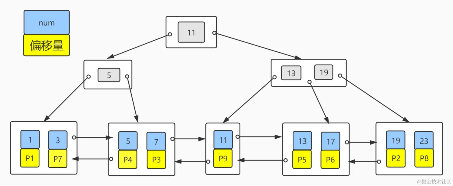二级索引子节点也只存储了索引列(num)和文件的偏移量(P),但可以看出num是有序的,这在范围查找(比如:where num > 3)是非常有利的,但文件的偏移量并没有规律,当需要回表查询其他字段,可能会导致多次随机I/O。