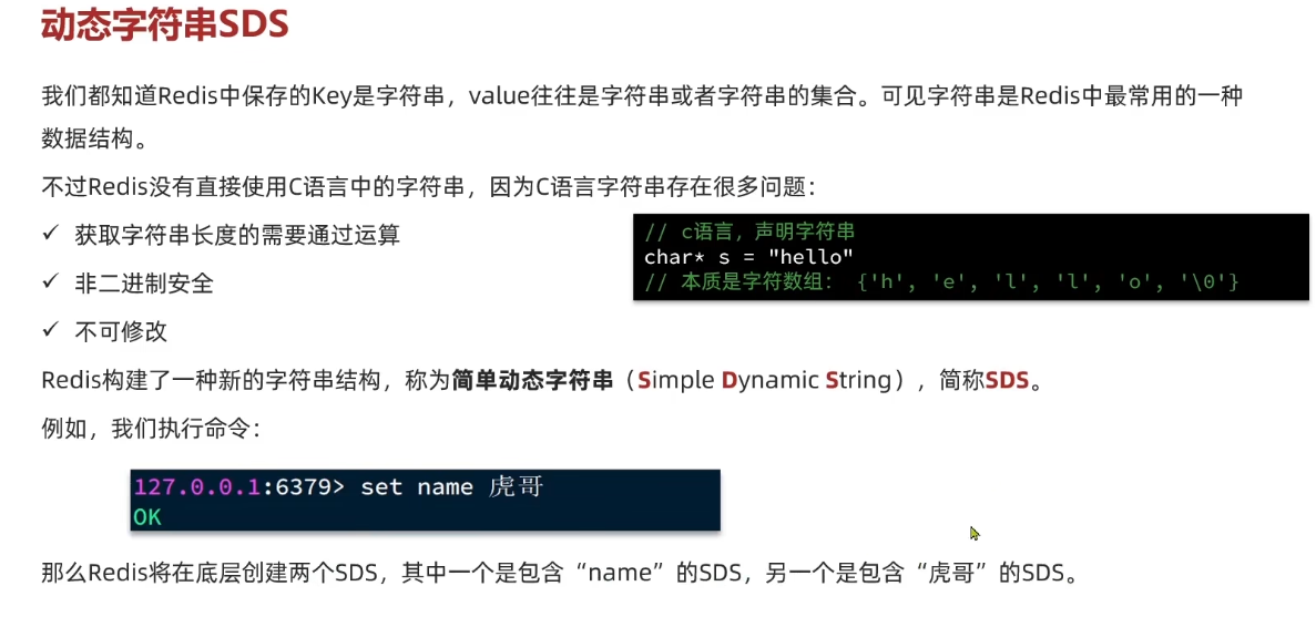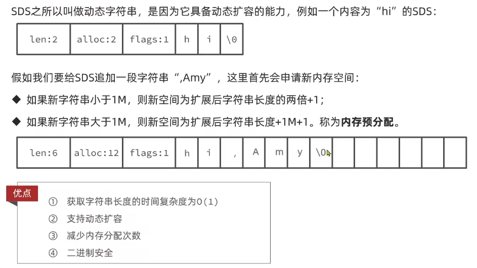 "hi"时,SDS 头部记录len=2, alloc=2(分配空间=实际占用)| len: alloc:2 | flags:1 | h | i | \0 | -