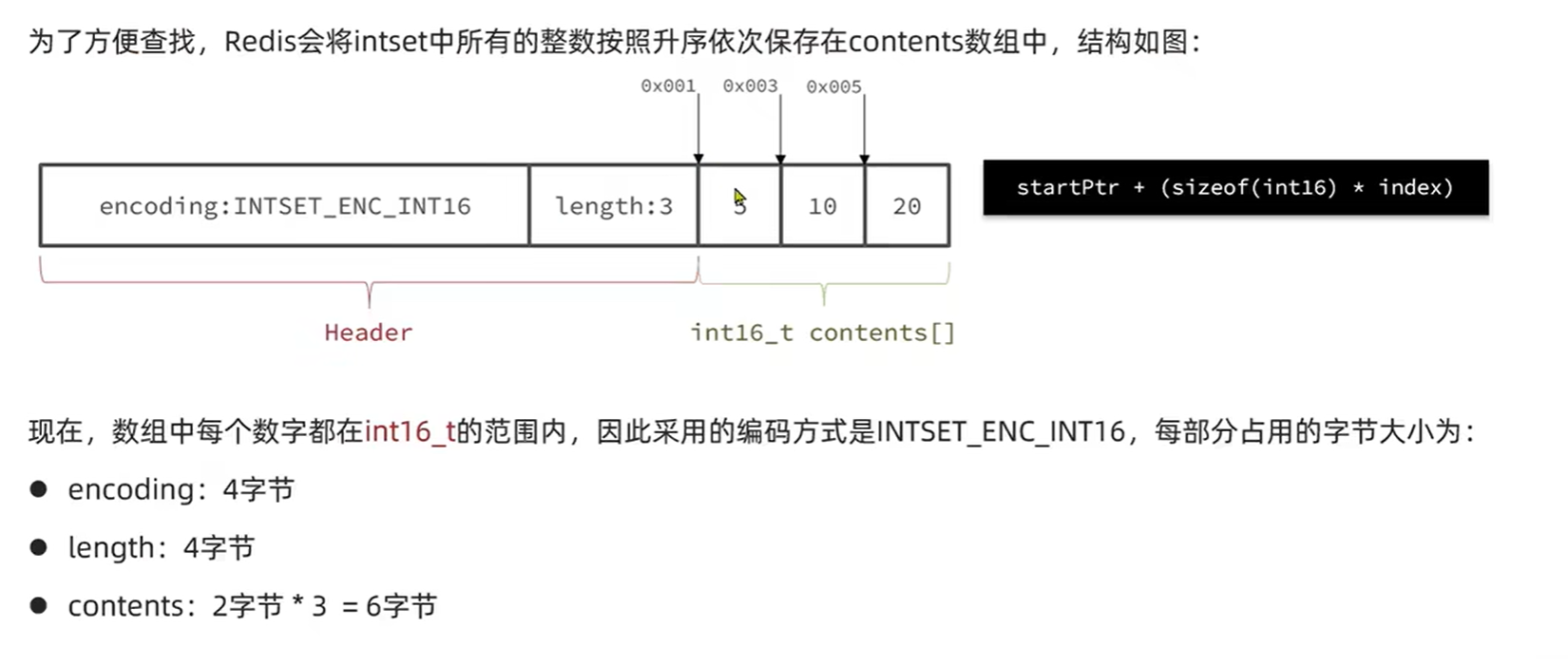 encoding = INTSET_ENC_INT16→contents实际是int16_t[](2字节/元素) - 若