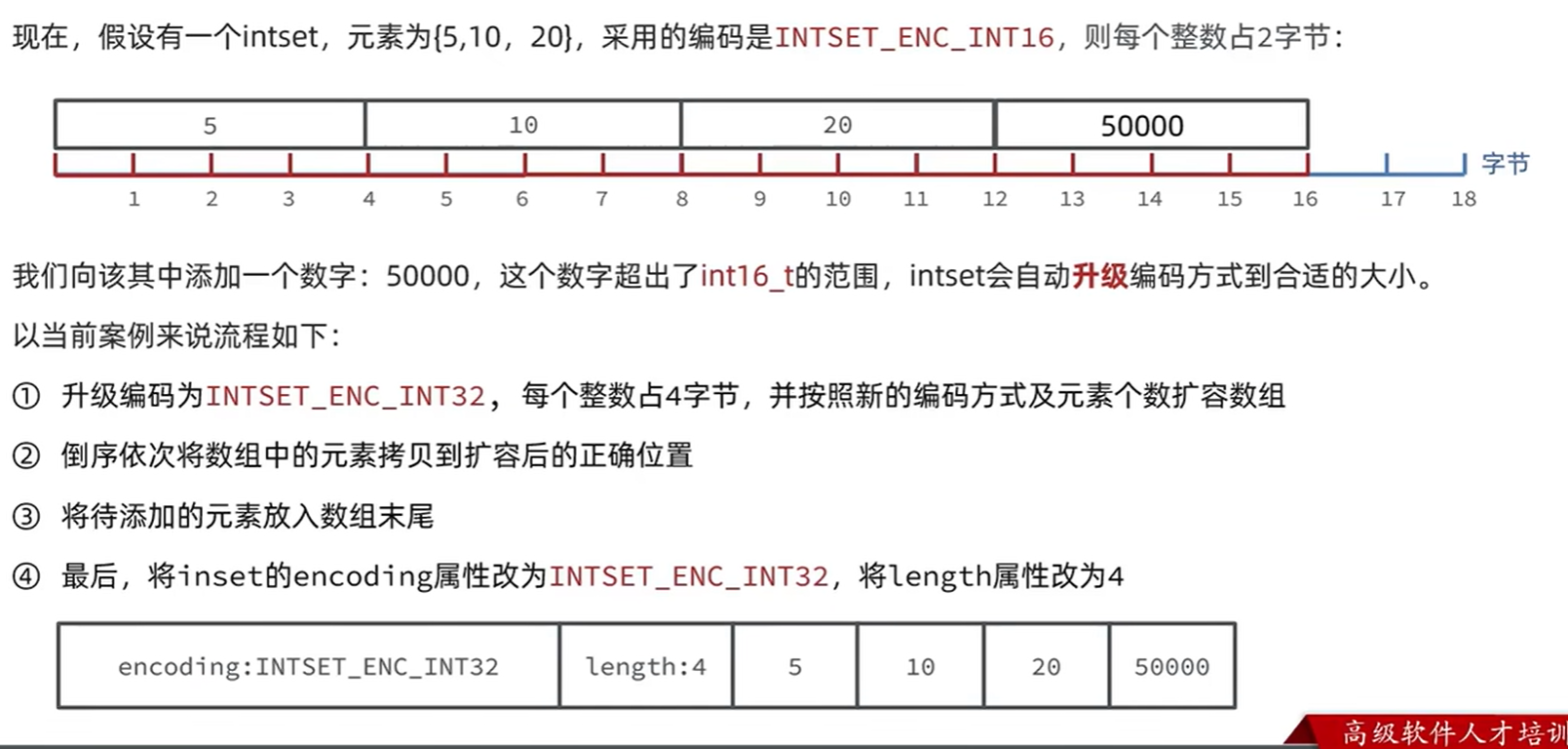 INTSET_ENC_INT32(每个整数占用 4 字节) - 步骤②:倒序拷贝现有元素:为了维持顺序和避免覆盖,系统倒序复制现有元素到新位置。图中示例:元素 20 从原位置(字节 4-6)拷贝到新位置(字节 8-12)
