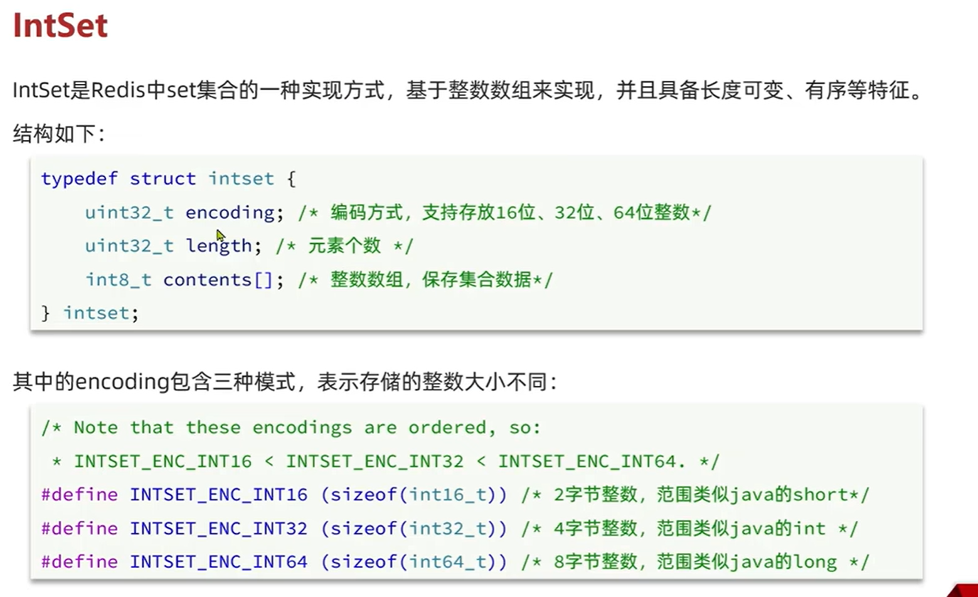 INTSET_ENC_INT16→ 存储int16_t(类似Java的short)INTSET_ENC_INT32→ 存储int32_t(类似Java的int)INTSET_ENC_INT64→ 存储int64_t(类似Java的long)