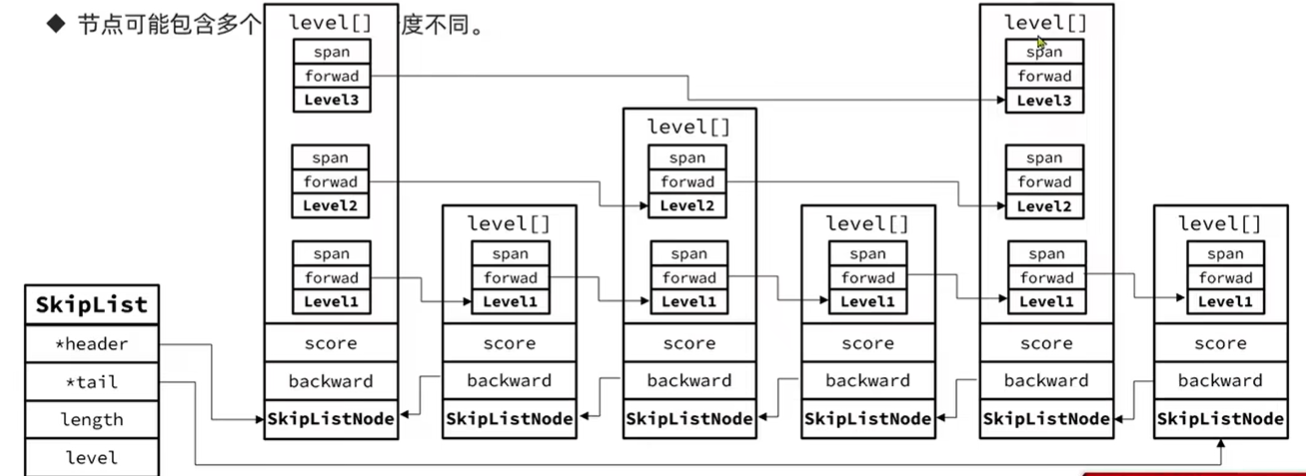 - 层(level):节点中用L1、L2、L3等字样标记节点的各个层,L1表示第一层,L2代表第二层,以此类推。每层都带有两个属性:前进指针和跨度。前进指针用于方位位于表尾方向的其他节点。而跨度则记录了前进指针所指向节点和当前节点的距离。