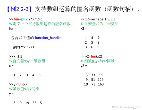 批量化作用于数组的每一个元素的运算 数组运算符:.*,./,.^(+,-不加“.”) 标量与数组的运算,也不必加“.” 如果对两个数组做数组运算,那么这两个数组的维数必须相同 数组运算为向量化运算,避免使用循环程序简洁,运行速度快 大量函数支持数组运算 二维数组和矩阵的形式相同,只是区别在于运算规则!