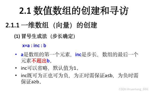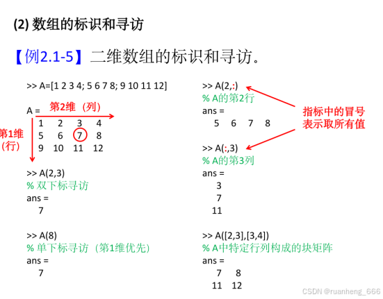 一、数组的维数和大小 只有一行或一列的数组是一维数组,行与列的数目都超过一的是二维数组 指令size可求出数组各维的大小,而指令length 可给出所有为中最大长度 二、数组的标识和寻访 双下标寻法(x,y) 单下标寻访(n)(第一维优先)