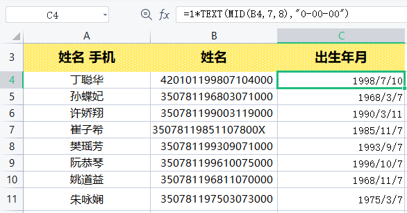首先使用MID函数从B4单元格的第7位开始,提取出表示出生年月的8个字符,结果为: