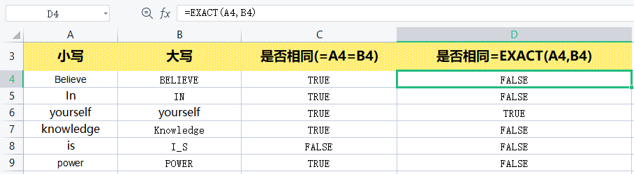 这个时候可以使用函数=EXACT(A4,B4)判断