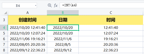 要从日期时间数据中提取出日期,可以使用以下公式: