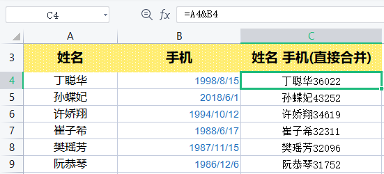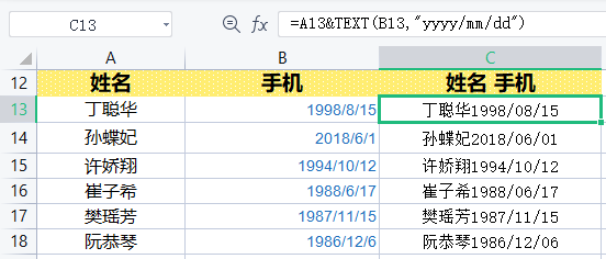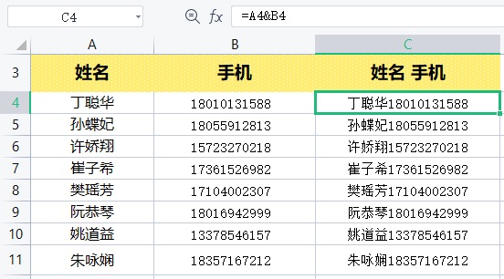 连接合并多个单元格中的内容,可以使用&符号完成。如下图,要合并A列的姓名和B列的手机号码,可以使用公式: