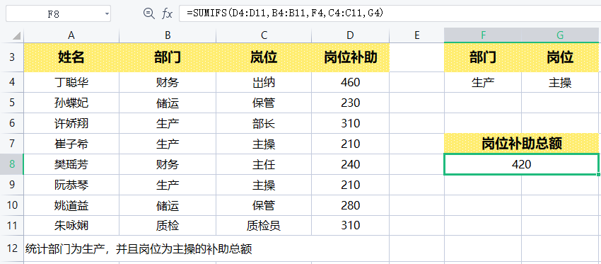 =SUMIFS(D4:D11,B4:B11,F4,C4:C11,G4)
